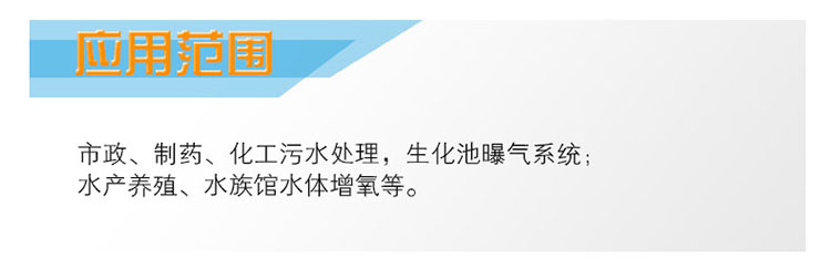 應(yīng)用范圍:市政、制藥、化工污水處理,生化池曝氣系統(tǒng);水產(chǎn)養(yǎng)殖、水族館水體增氧等。